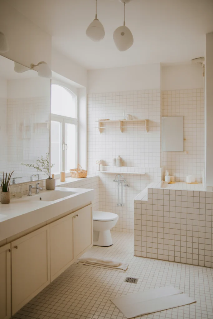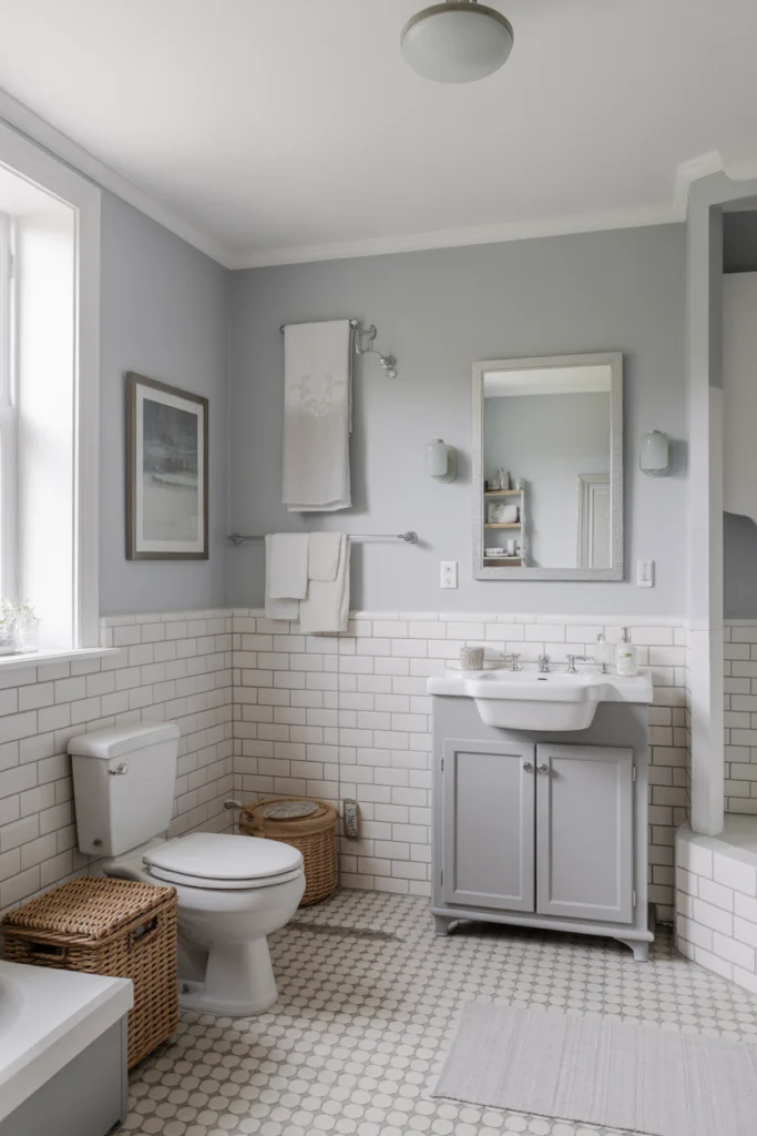 Functionally, soft gray hides minor imperfections better than pure white and maintains a clean appearance over time. When combined with good lighting, gray creates a spa‑like environment that feels both relaxing and practical. It’s an excellent choice for homeowners who want subtle elegance without sacrificing brightness.