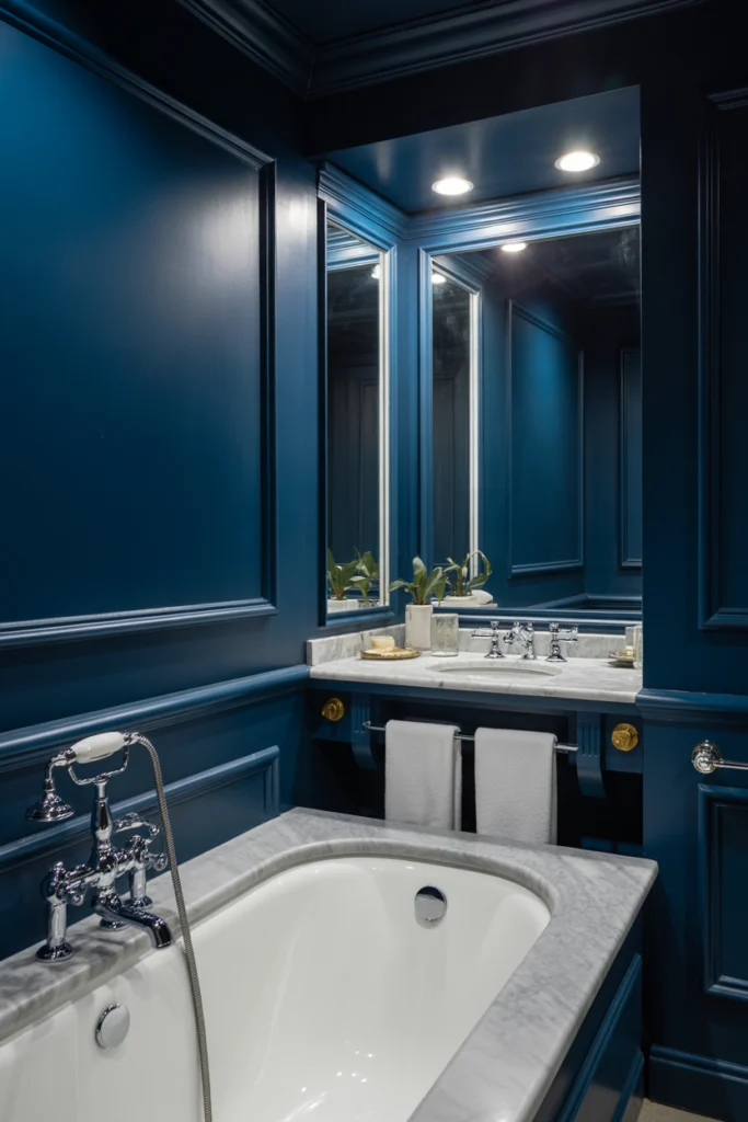Navy blue is a bold bathroom paint color that adds depth and luxury to the space. When used correctly, it creates a dramatic yet refined look, especially in larger bathrooms or powder rooms.