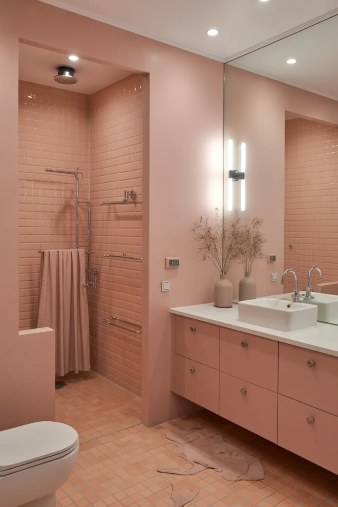 Blush pink has emerged as a stylish and modern bathroom paint color. When used in soft, muted tones, it adds warmth and character without appearing overly bold.