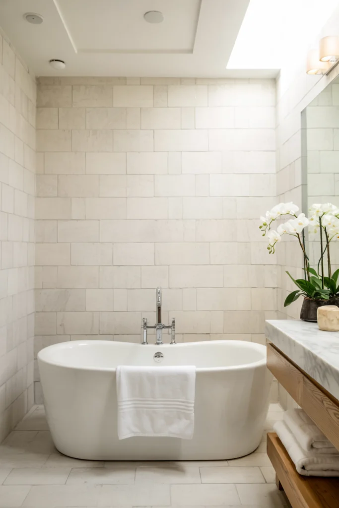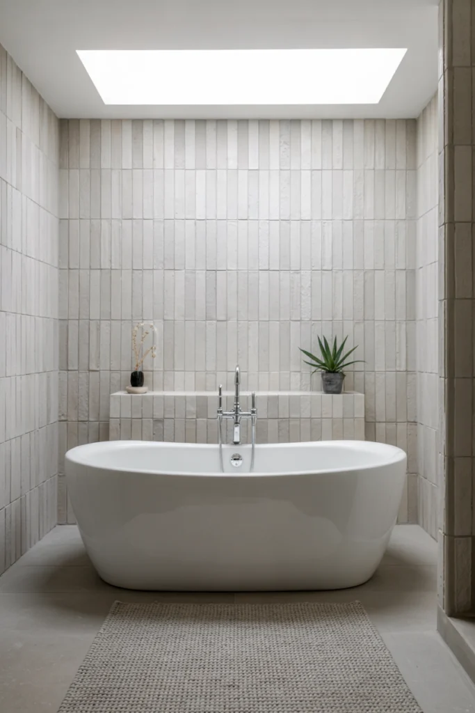 Installing tiles vertically creates the illusion of height, making bathrooms feel taller and more open. This bathroom tile idea is especially effective in small or low‑ceiling spaces.