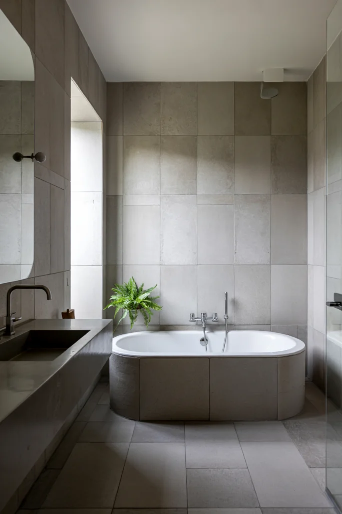 Large‑format tiles are increasingly popular in modern bathroom tile ideas due to their sleek appearance and minimal grout lines. These oversized tiles create a seamless look that makes bathrooms feel more spacious and refined.