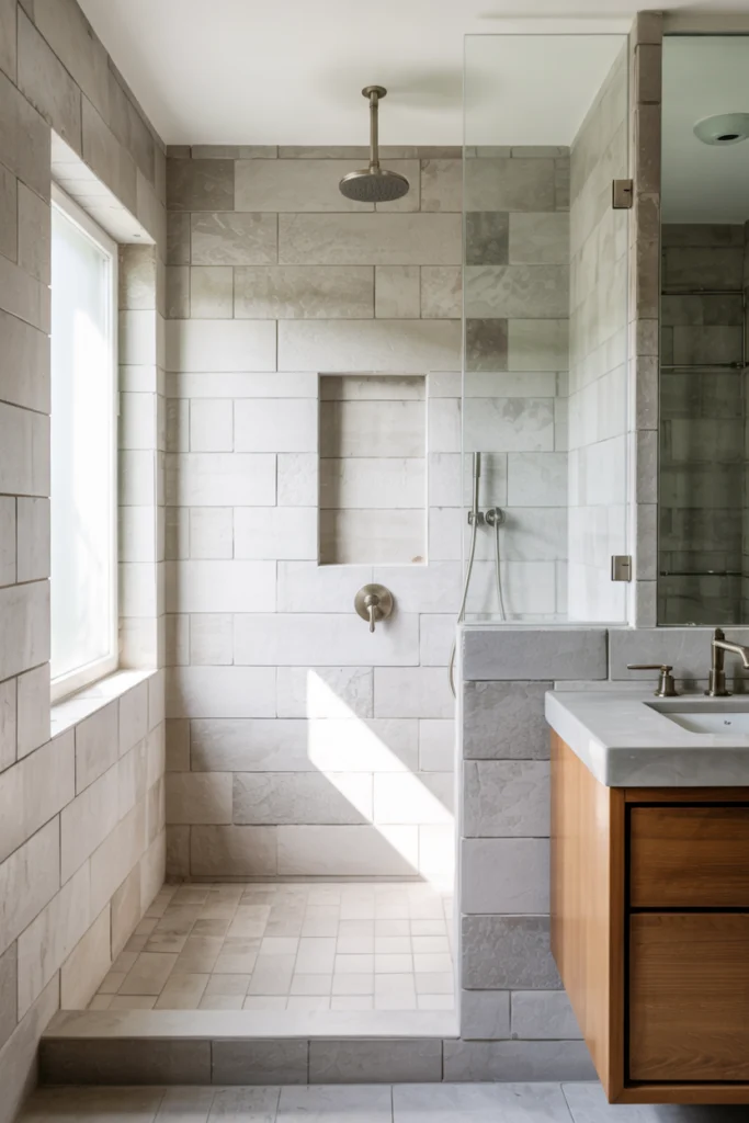Functionally, fewer grout lines mean easier cleaning and reduced maintenance. Large‑format tiles work especially well on floors and shower walls, providing durability and visual continuity. This option is ideal for homeowners who prefer modern aesthetics and low‑maintenance surfaces.