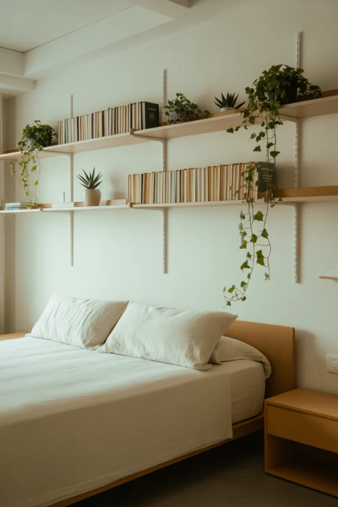 Keep the styling simple to avoid clutter. A mix of small décor items, framed photos, and plants creates a well-balanced display. Floating shelves also help organize your room while adding a clean, modern touch. They work well above nightstands, dressers, or in unused corners.