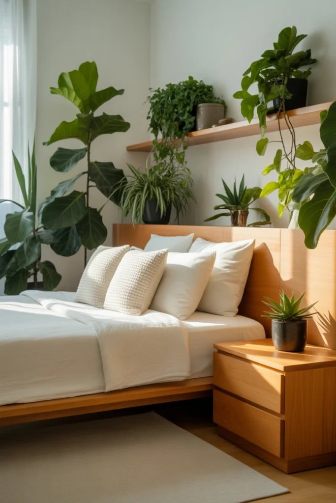 Indoor plants bring life, freshness, and natural color to your bedroom. Even a few small plants can make the room feel more inviting and balanced. You can place them on shelves, bedside tables, or near windows for the best effect. Plants also help improve air quality and reduce visual heaviness.