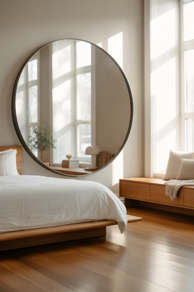Mirrors also work well as focal points. A large mirror behind the bed can replace artwork, while a tall standing mirror brings luxury and function. The right design adds brightness, making your bedroom feel airy and inviting. This idea works for both large and small spaces.
