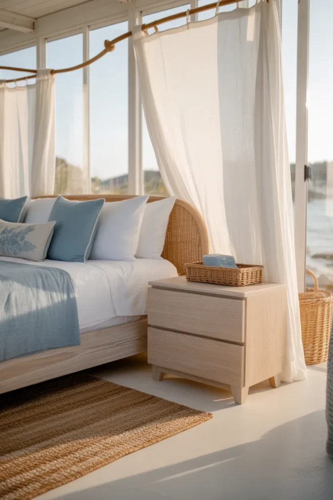To enhance the coastal theme, add striped throw pillows, woven chairs, nautical artwork, or glass accents. Keep furniture light and airy, and choose white or pastel bedding. Sheer curtains let natural light flow freely. This Bedroom Makeover Idea is ideal for those who love the ease and simplicity of coastal living.