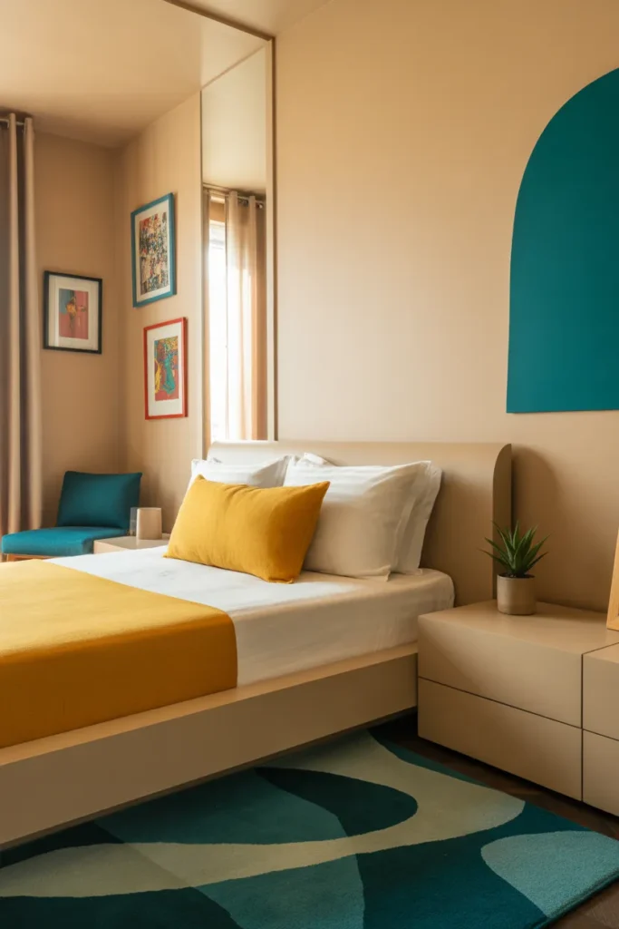 A color pop makeover introduces bold, vibrant hues into an otherwise neutral bedroom. Bright colors such as teal, mustard, coral, or deep green can be used on accent chairs, pillows, bedding, or artwork. This Bedroom Makeover Idea adds energy and personality without overwhelming the room.