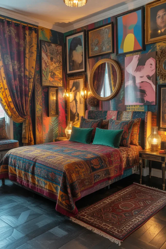 To prevent the space from feeling chaotic, choose a cohesive color palette and distribute patterns intentionally. Mix materials like velvet, brass, wood, and woven textures for depth. This Bedroom Makeover Idea suits creative personalities who love dramatic, personalized interiors.