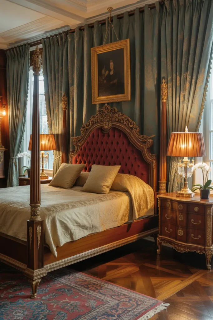 Traditional luxury bedrooms offer a timeless, elegant aesthetic with rich materials and ornate details. Carved wood furniture, tufted headboards, patterned drapery, and antique-style lighting create a sophisticated environment. Warm neutrals, deep jewel tones, and metallic accents define the palette.