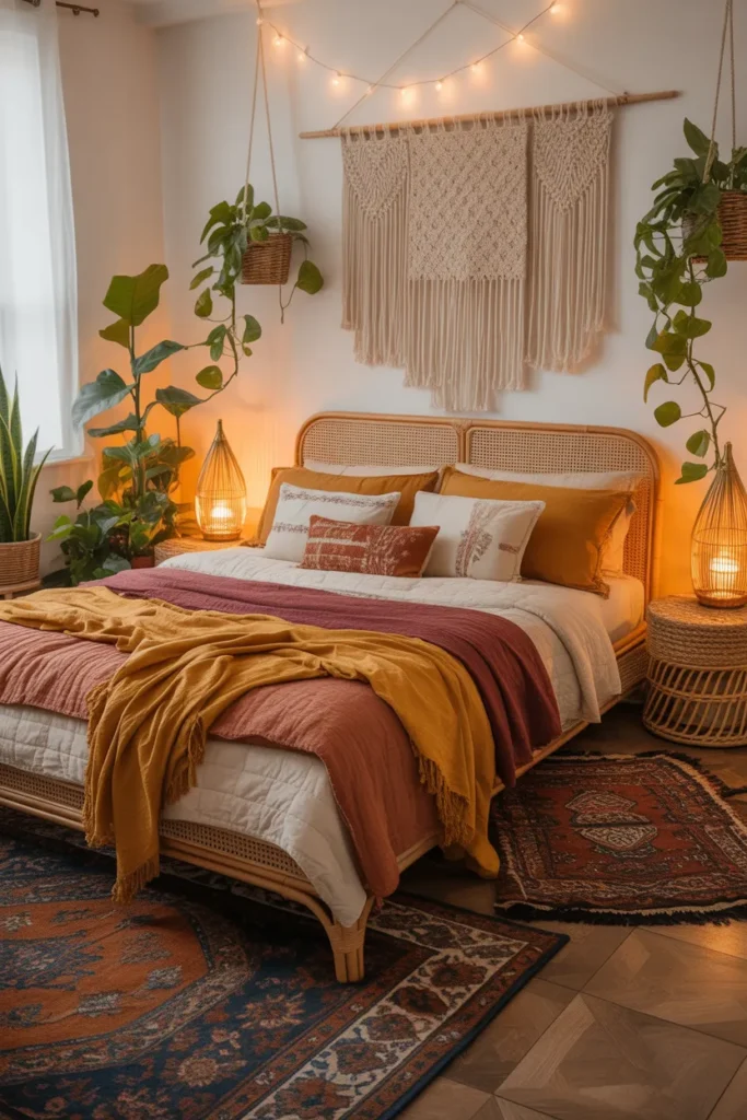 Complement the boho aesthetic with warm lighting such as lanterns, string lights, or patterned lamps. Combine earthy tones with occasional bright pops of color. Create cozy seating areas with poufs or floor cushions. Plants add freshness and bring the bohemian style to life. This bedroom makeover results in a warm, expressive, artistic space full of personality.