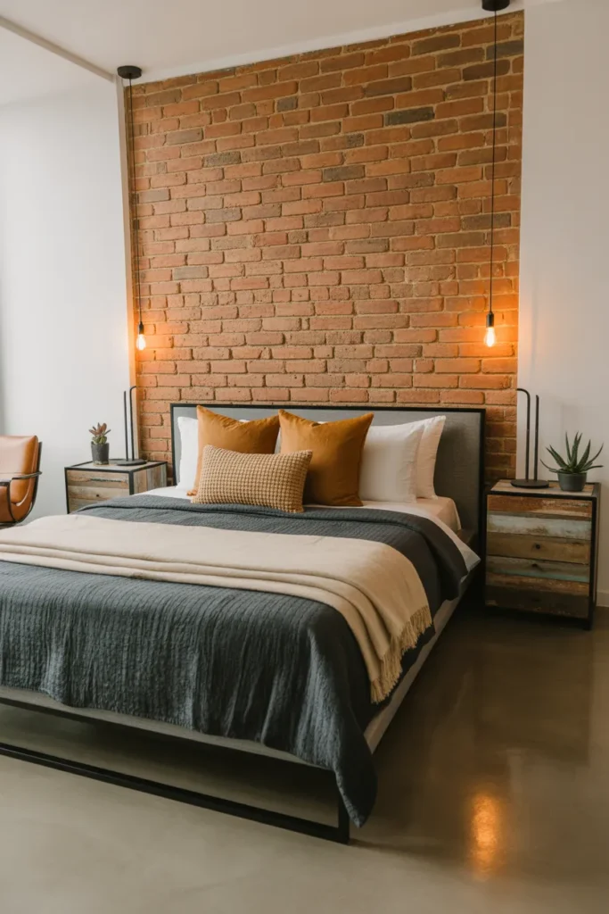 Industrial bedrooms feature raw materials such as metal, concrete, and exposed brick. This Bedroom Makeover Idea blends urban modernity with rustic warmth, creating a bold and edgy aesthetic. Metal bed frames, minimalist lighting, and distressed wood are common elements. Industrial style emphasizes strong lines, neutral colors, and functional décor.