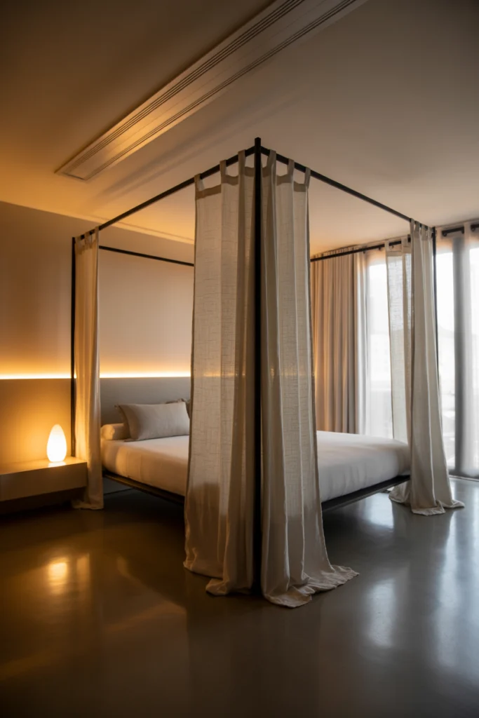 To complement the canopy, add floor-length curtains, warm ambient lights, and coordinated décor elements. Even in smaller bedrooms, a slim-frame canopy can create a sense of luxury without overwhelming the space. This idea is perfect for homeowners seeking a dramatic yet refined design.