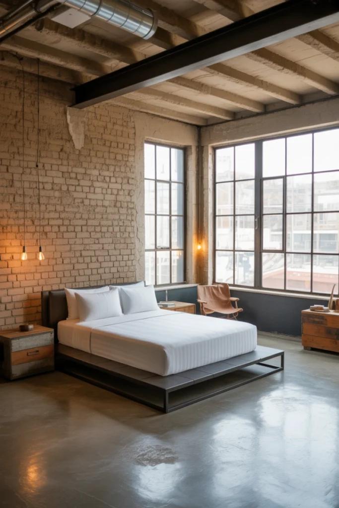 9. Modern Industrial Bedroom with Raw Finishes