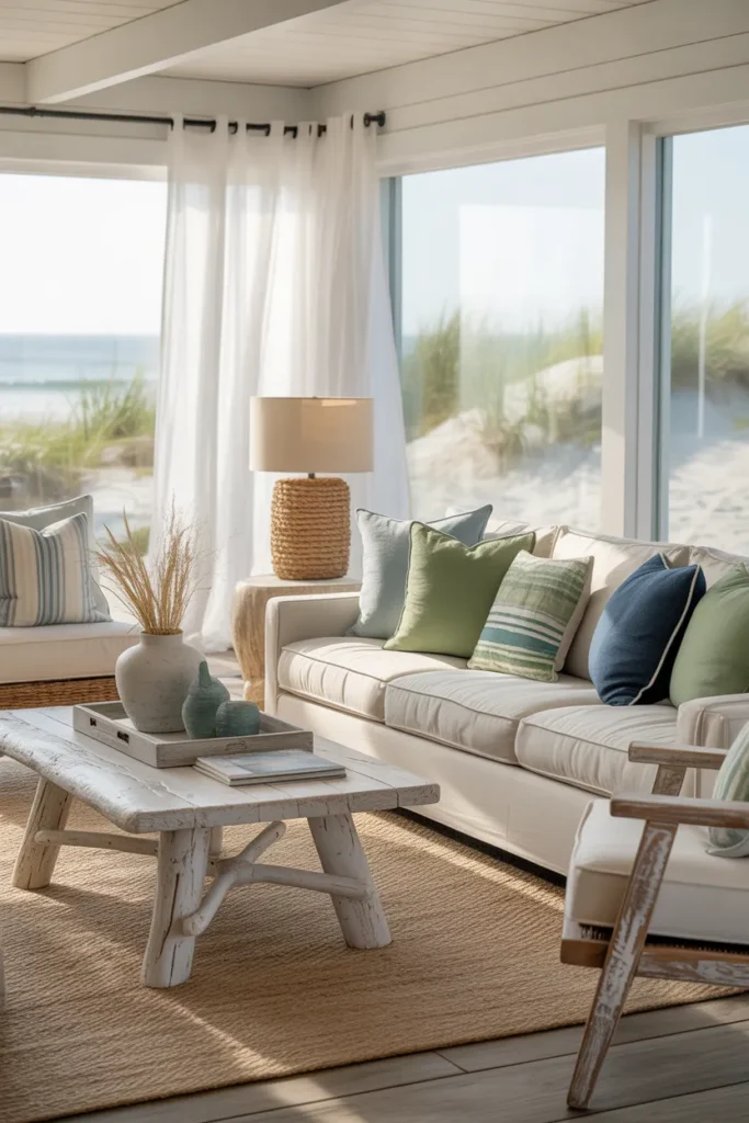 Add seaside-inspired décor like driftwood, shells, and nautical artwork. This palette brings relaxation and freshness, ideal for open, airy spaces.