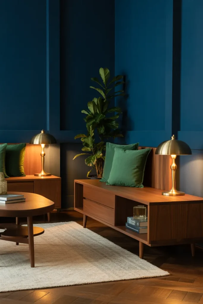 Deep blue walls set a bold foundation, softened with green accessories like plants, pillows, or throws. This combination balances drama with freshness.