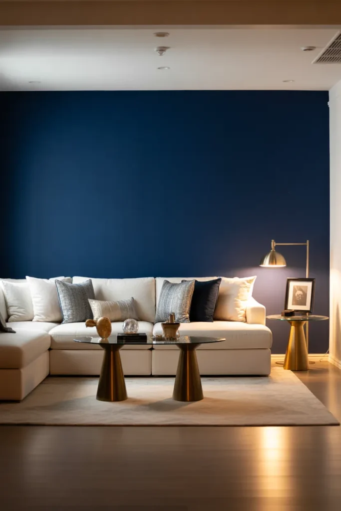 A navy blue accent wall brings instant elegance and sophistication to your living room. Pair it with lighter-colored furniture, gold or brass accents, and layered lighting for a luxurious yet welcoming feel. Navy works well behind a sofa, fireplace, or media wall.