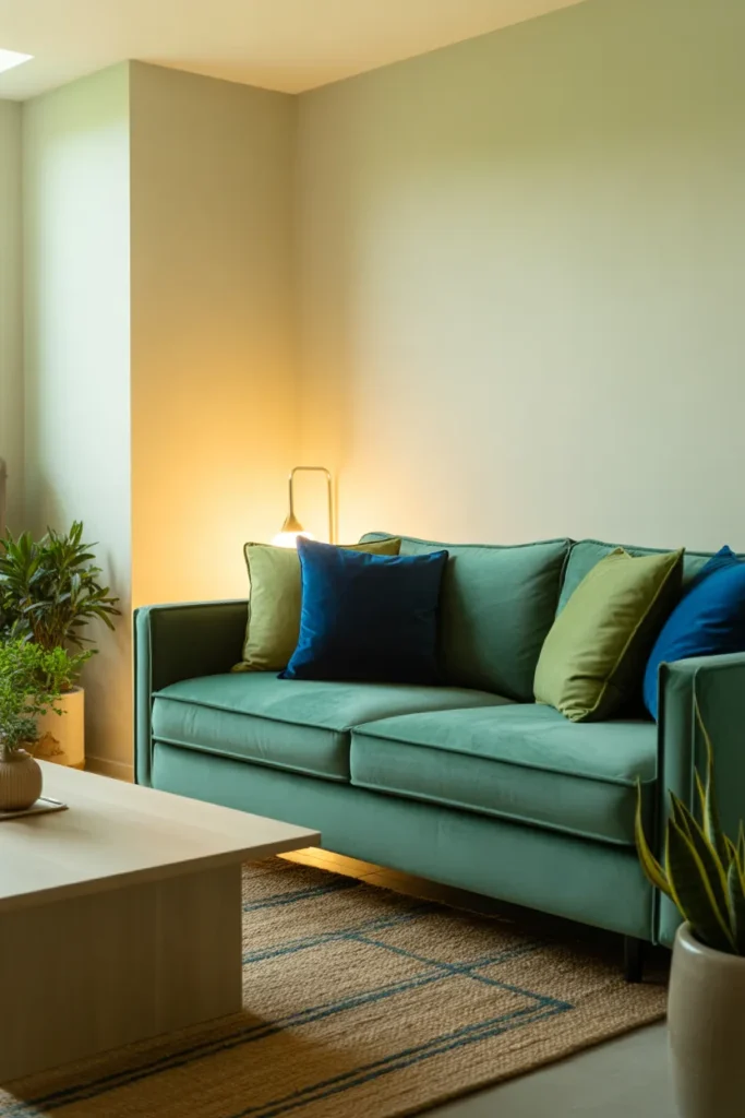 A green velvet sofa creates a luxurious focal point. Pair with blue or neutral walls and warm wood furniture to maintain balance.