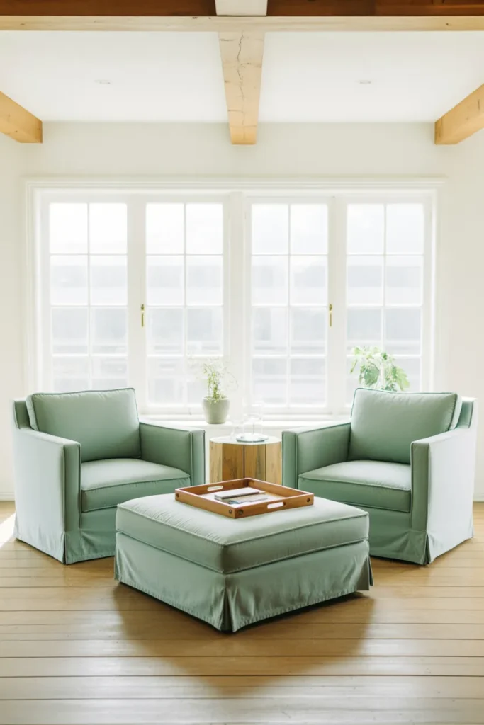 Mint green furniture introduces a light, refreshing feel into any living room. From accent chairs to ottomans, mint green pieces can soften the overall palette while adding visual interest. Pair with white, beige, or light wood tones for a balanced look.