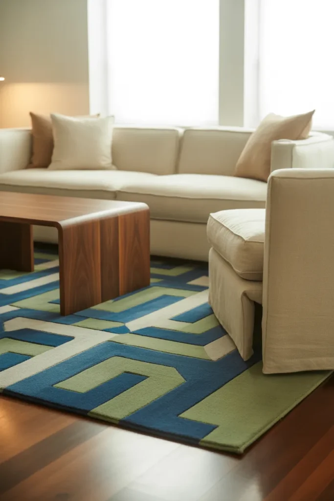 Incorporate a geometric rug in shades of blue and green to anchor your living room. Rugs define the seating area, add texture, and introduce color without overwhelming the walls or furniture. Choose patterns that complement your existing décor.