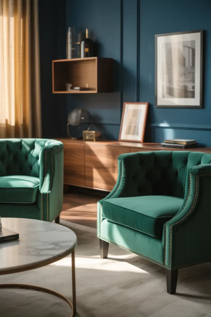 Emerald green velvet armchairs add luxury and a touch of drama. Pair them with neutral or soft blue walls and warm wooden furniture for balance. Velvet enhances the sense of sophistication and comfort in your living space.