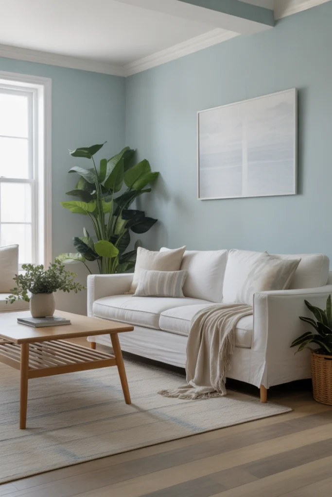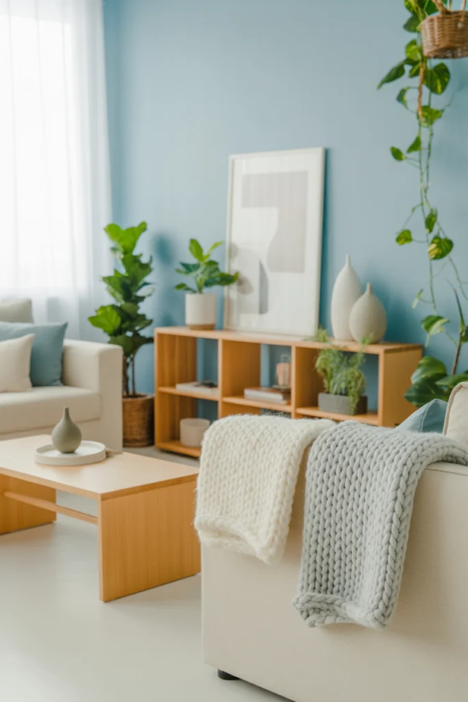 Sky-blue tones blend perfectly with Scandinavian design principles, which prioritize simplicity, natural elements, and bright spaces. A sky-blue living room feels peaceful and uplifting, especially when paired with blonde wood furniture and white accents. This palette is especially effective in small spaces because it enhances natural light and creates a clean, uncluttered aesthetic. Scandinavian blue living rooms emphasize functionality and comfort through thoughtful design.
