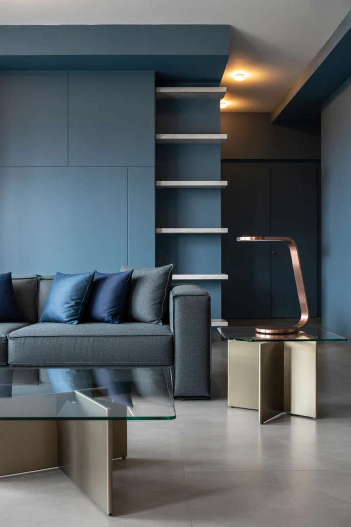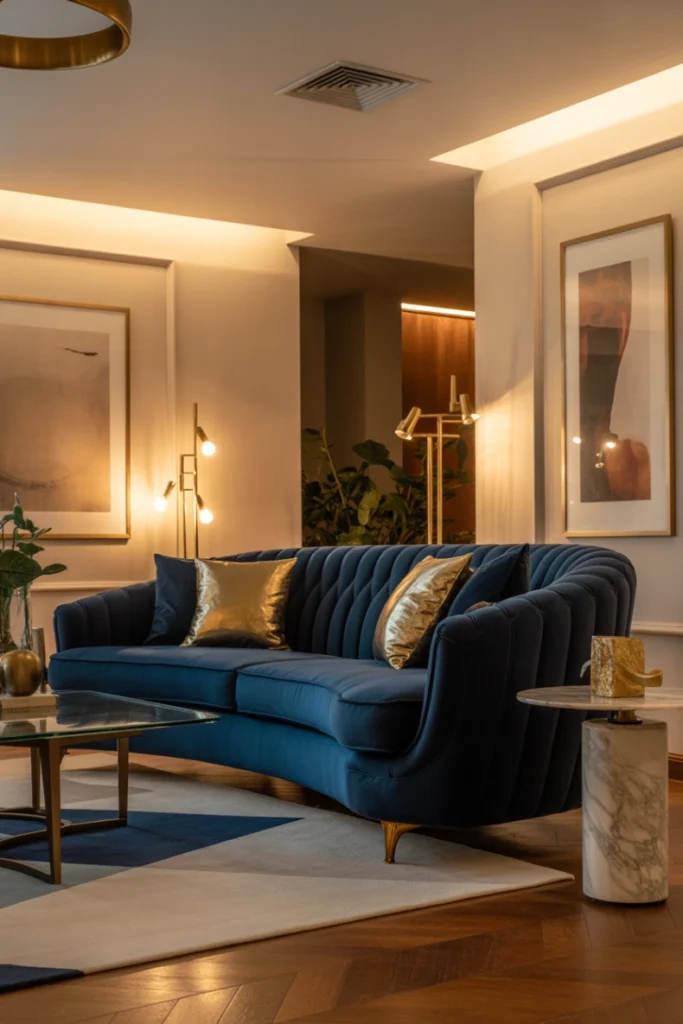 To prevent the room from feeling too opulent, balance the look with neutral sofas, soft textiles, or understated artwork. Incorporating glass or marble elements can further enhance the luxe aesthetic. This Blue Living Room Idea suits homeowners who appreciate bold, glamorous design.