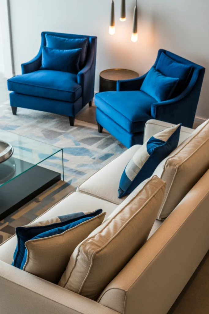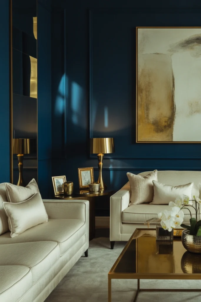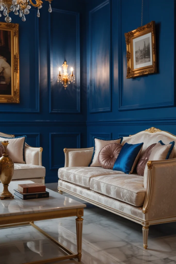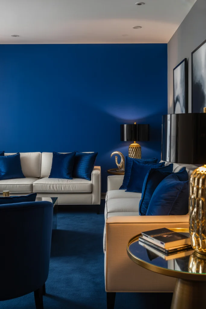Royal blue combined with gold accents creates a luxurious, high-impact design aesthetic. This pairing exudes refinement and sophistication, making it perfect for formal living rooms or statement-making interiors. Royal blue walls or furniture establish a rich foundation, while gold details elevate the overall elegance. This vibrant combination is especially striking in large spaces.