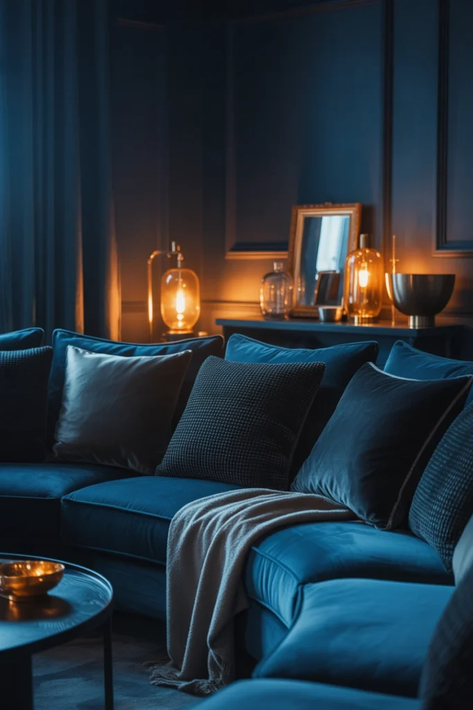 To balance the intensity, incorporate soft materials like velvet pillows, warm wood flooring, or brass accents. Strategic lighting—such as wall sconces or warm LED strips—adds depth and warmth. This Blue Living Room Idea is excellent for homeowners who enjoy bold, immersive color experiences.