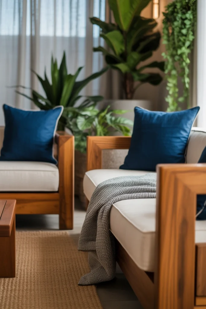 To refine the design, incorporate woven textures, natural textiles, and greenery. Clean lines and neutral backdrops allow the blue and wood contrast to stand out. This Blue Living Room Idea suits nature-inspired or Scandinavian-style homes that value simplicity and harmony.