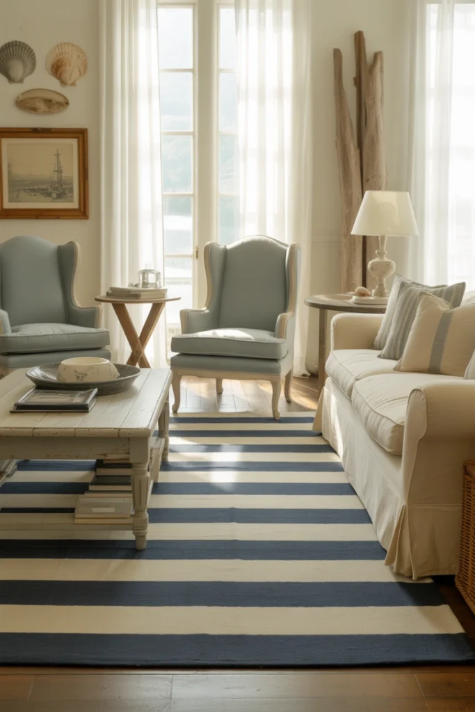 Blue stripes bring classic charm and timeless appeal to living rooms. Whether featured on rugs, wallpapers, or upholstery, striped patterns create visual rhythm and structure. Blue stripes align beautifully with coastal, cottage, or traditional living room styles, adding personality without overpowering the space.