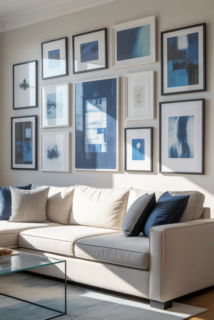 Blue-themed artwork offers a creative way to integrate color into your living room without committing to new furniture or paint. From abstract blue paintings to nature-inspired prints, wall art adds focus and personality. A curated gallery wall allows for diverse compositions while maintaining cohesiveness through color.