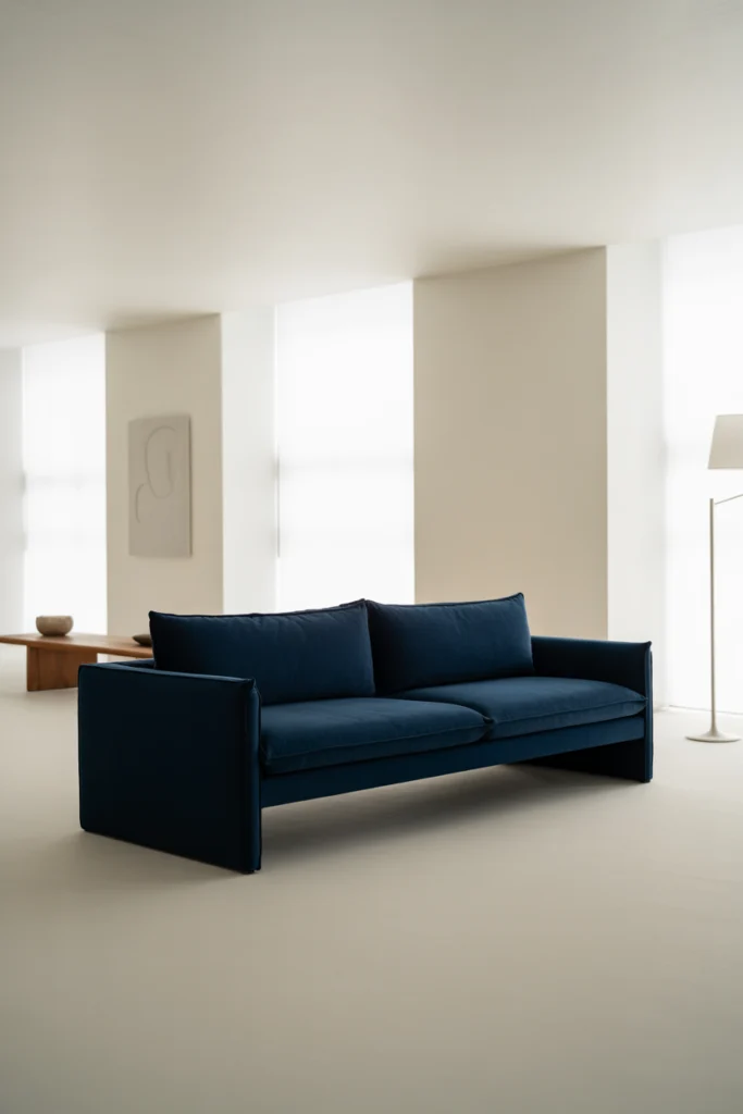 A deep blue velvet sofa instantly elevates any living room with its richness and plush texture. Velvet adds a luxurious feel, while the blue tone enhances its bold presence. This type of sofa works beautifully as a statement piece in modern, transitional, or eclectic interiors. It brings personality and depth to the room, making it ideal for homes seeking a touch of glamour.