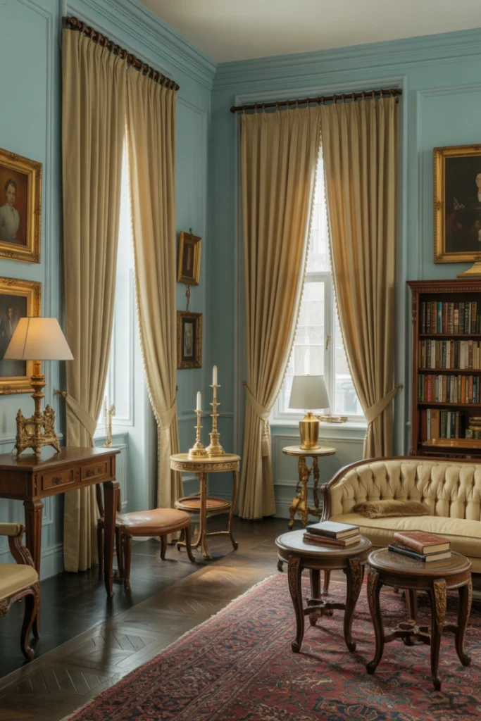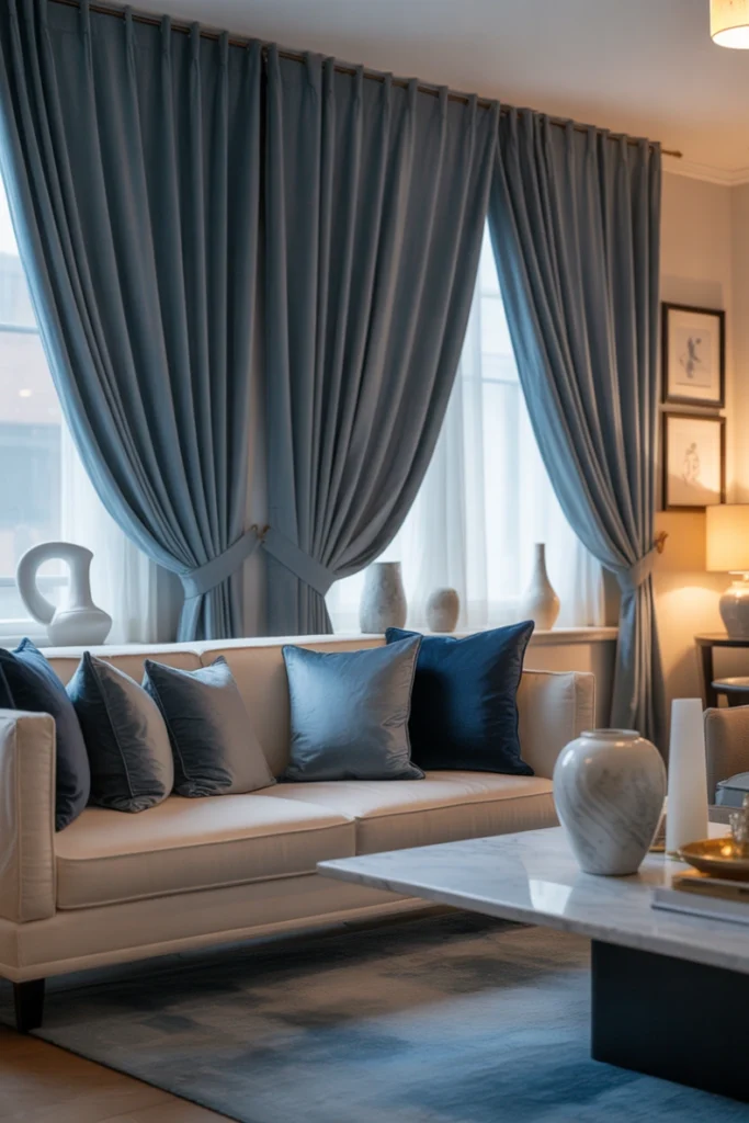 Blue curtains introduce softness, elegance, and height to a living room. Whether you choose sheer pale blue drapes or heavy navy velvet panels, curtains dramatically influence the room’s ambiance. Blue window treatments add color vertically, drawing the eye upward and enhancing a sense of spaciousness.