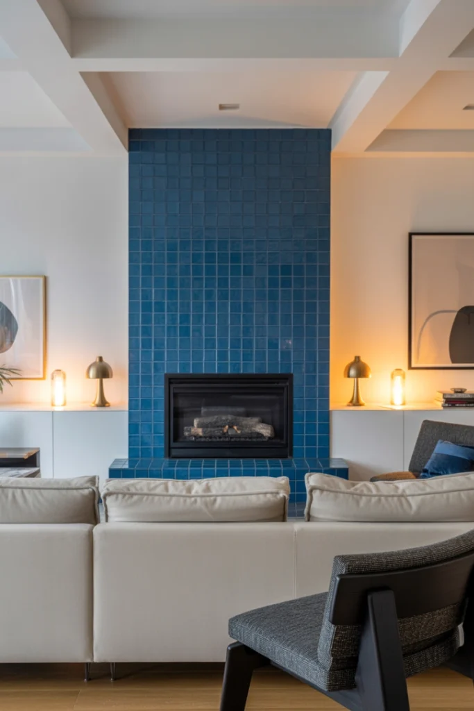 To enhance the look, pair the fireplace with complementary décor such as brass accents, natural wood mantels, or simple artwork. Keep surrounding furniture neutral to ensure the fireplace remains the focal point. This Blue Living Room Idea is ideal for homeowners who love expressive, show-stopping décor features.
