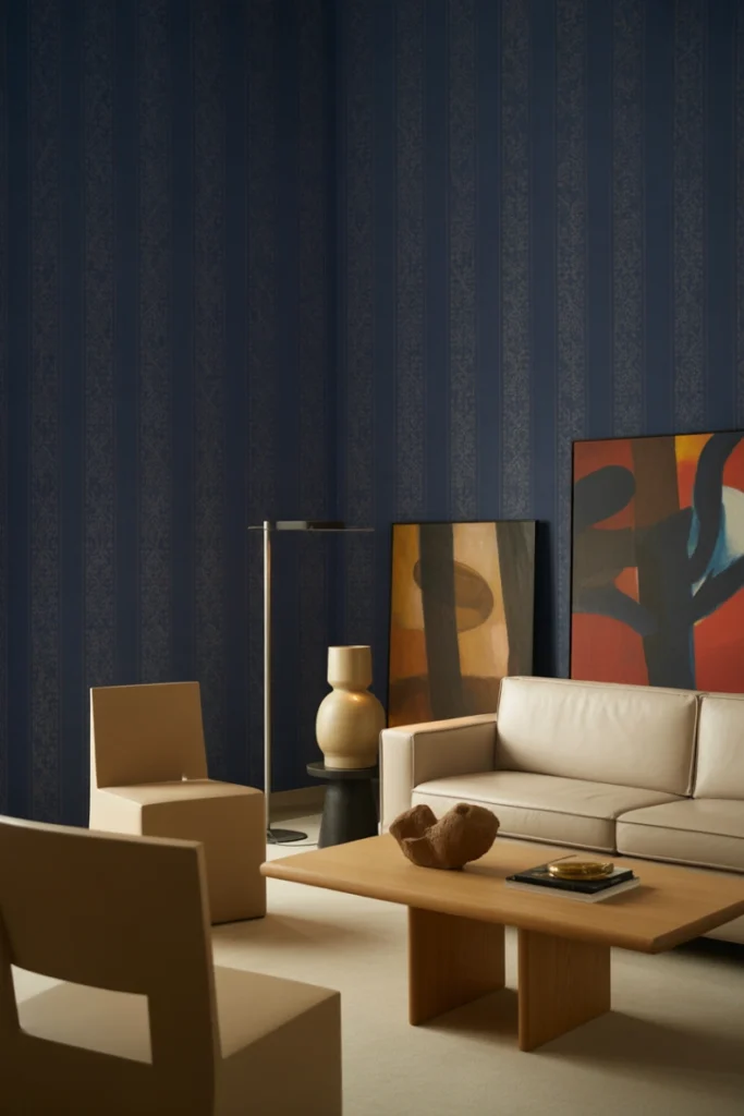 To avoid overwhelming the room, pair patterned wallpaper with simple furniture and neutral-colored textiles. A cohesive palette ensures the wallpaper remains a focal point without creating visual clutter. This Blue Living Room Idea works beautifully for homeowners who love dramatic yet elegant design statements.