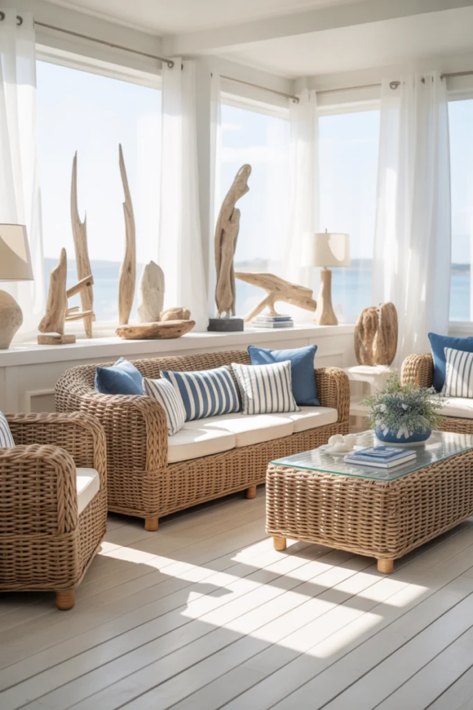 A blue and white color palette is iconic for coastal-themed living rooms. This combination reflects the colors of the ocean and sky, creating a refreshing, breezy environment. Light blue walls, white sofas, and subtle nautical décor evoke a sense of tranquility reminiscent of beachside retreats. This style is perfect for homeowners who want their living room to feel relaxed and inviting, ideal for warm-weather homes or anyone drawn to coastal charm.