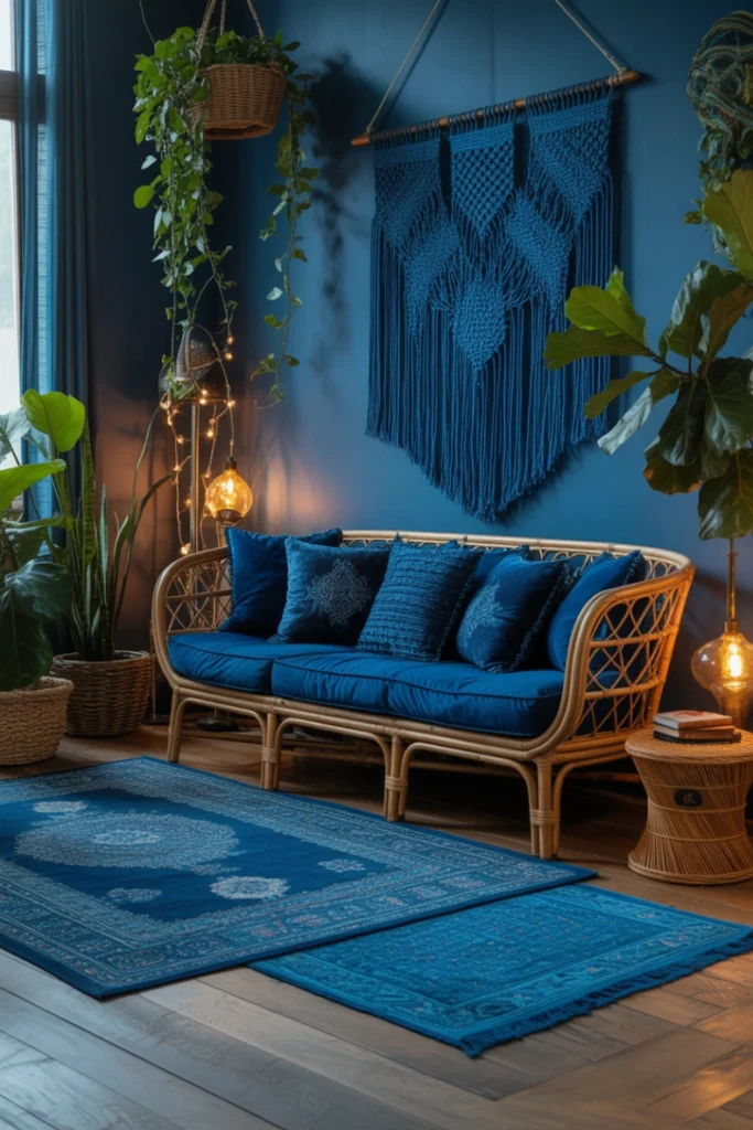 Blue is a stunning foundation for a bohemian-inspired living room. Rich indigos, turquoise accents, and patterned textiles create a space filled with personality and artistic flair. Boho blue living rooms typically feature layered rugs, macramé, eclectic décor, and a relaxed, free-spirited energy. Blue tones help ground the design amidst the variety of patterns and textures.