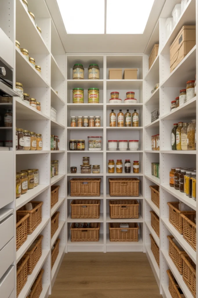 You can label each basket to keep everything organized. This design idea works for all pantry sizes and themes. It helps maintain order while improving the visual appeal of your storage. The combination of baskets and shelves creates a balanced, organized look.