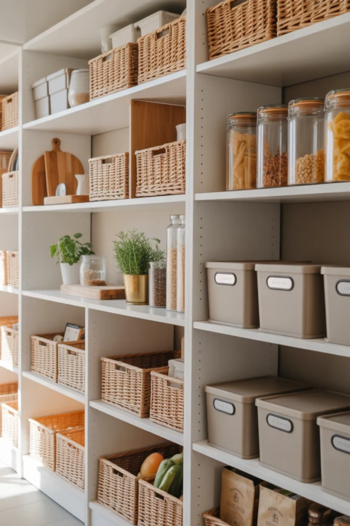 Baskets add warmth and structure to any pantry. They help you group items like snacks, baking supplies, and fresh produce. Whether you choose wicker, wire, or plastic baskets, they make your pantry look tidy and stylish. Baskets also hide small items that might otherwise look messy on shelves.