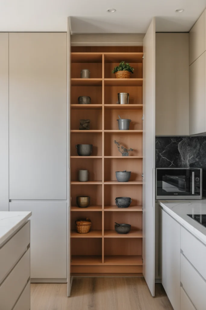 Inside, you can add shelves, drawers, and lighting to make the space functional. The hidden design adds a sense of surprise and luxury. It is perfect for people who want a sleek, simple kitchen without open or visible pantry shelving.
