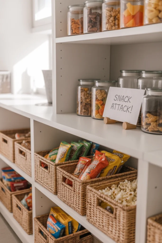 A snack station makes your pantry more convenient, especially for families. You can store snacks, cereals, drinks, and lunch items in a central spot. Baskets and jars help keep everything organized and easy to grab. This section works well for kids or busy adults who want quick access to ready-to-eat food.