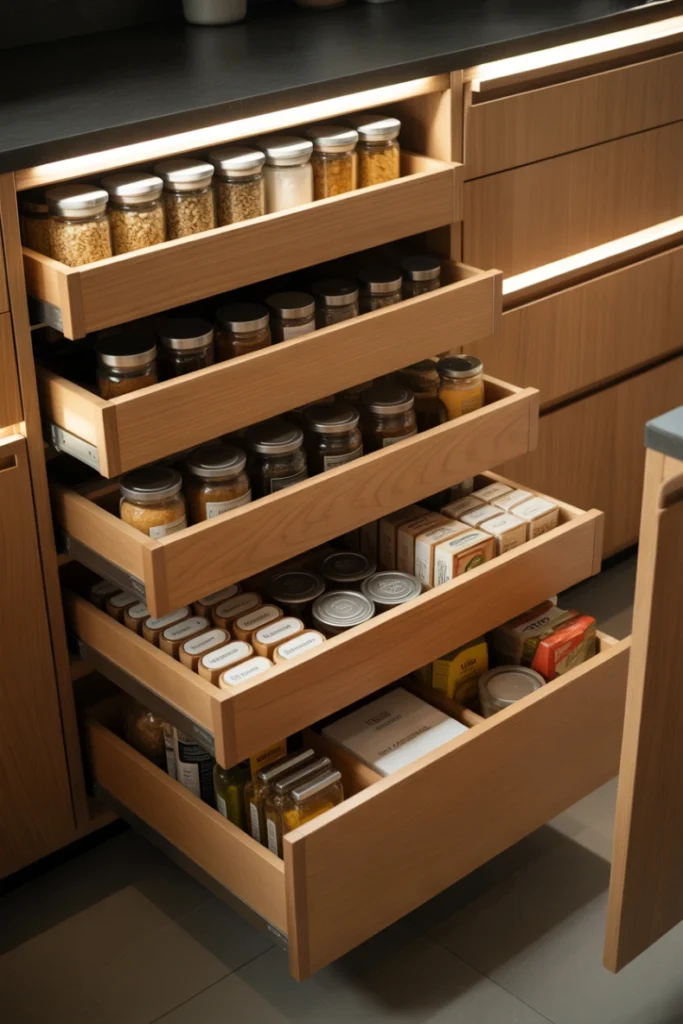 They also improve space efficiency. You can organize drawers by category or frequency of use. Smooth sliding rails make opening and closing effortless, while dividers help keep items in order. This pantry design idea adds both convenience and modern functionality to your kitchen. It is a simple upgrade that makes a big difference in everyday use.