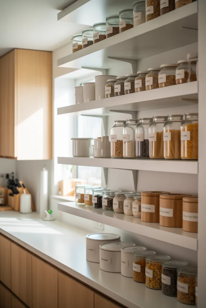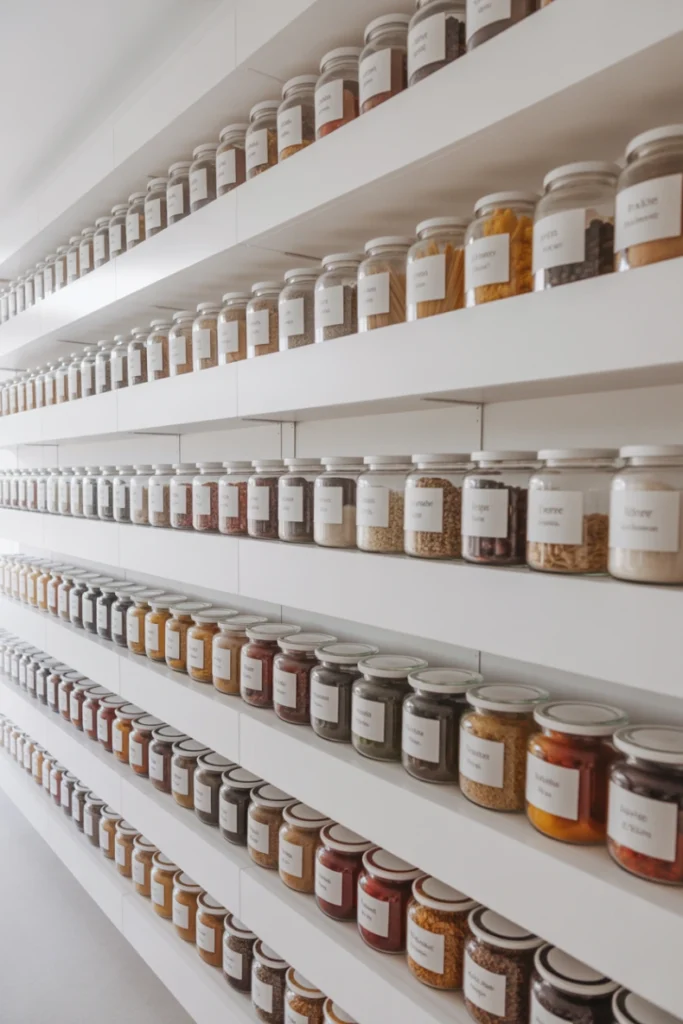 Glass jars reduce waste and keep food fresh longer. When you group them together on shelves, they create a uniform, magazine-worthy appearance. Add labels for extra clarity and organization. This idea works for small spaces, walk-in pantries, and open pantry designs. It is simple, stylish, and highly effective.
