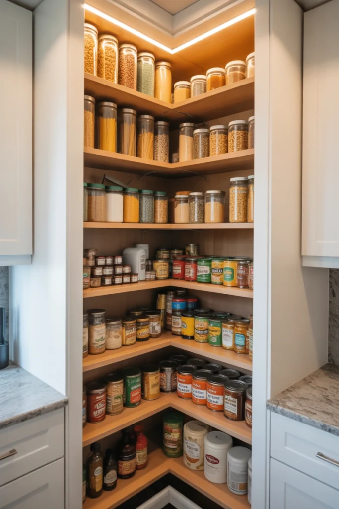 Corner areas often get ignored in kitchens, but they offer valuable storage potential. A corner pantry can turn an awkward space into a highly functional storage area. You can install angled shelves, lazy susans, or L-shaped designs to maximize every inch. This layout works well in small kitchens, apartments, and homes with limited wall space.