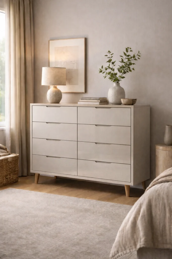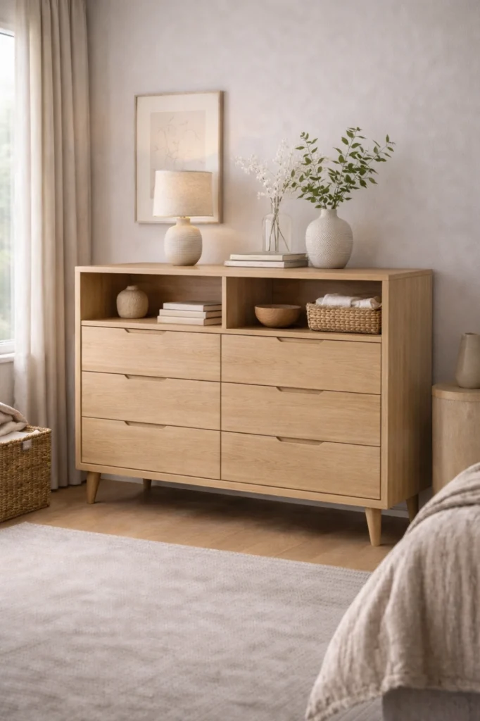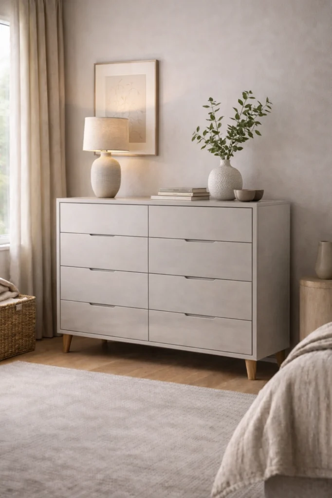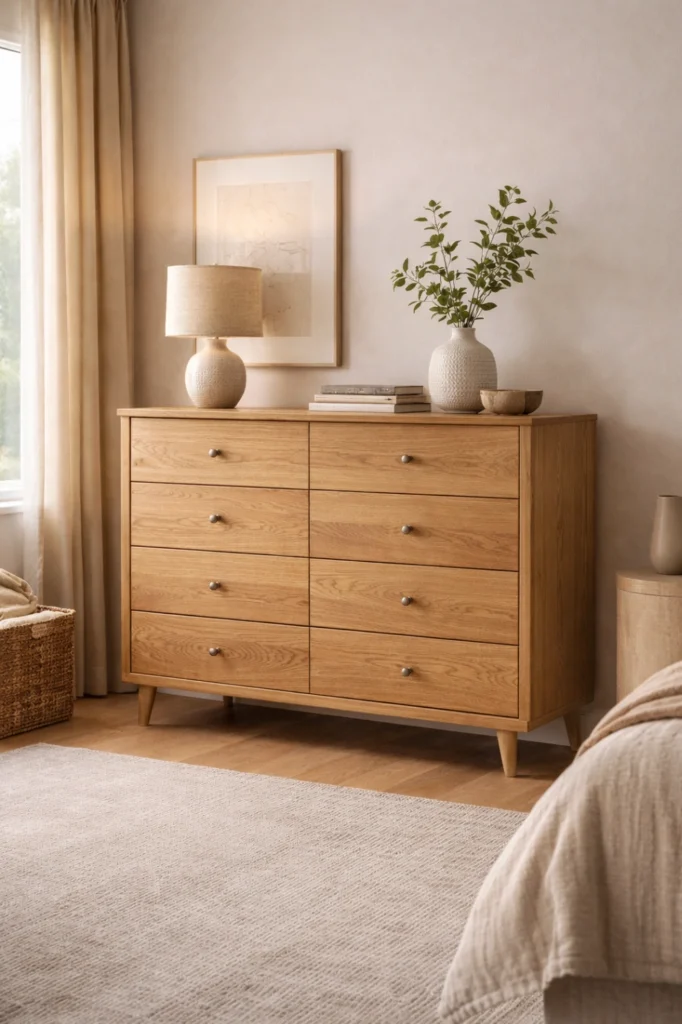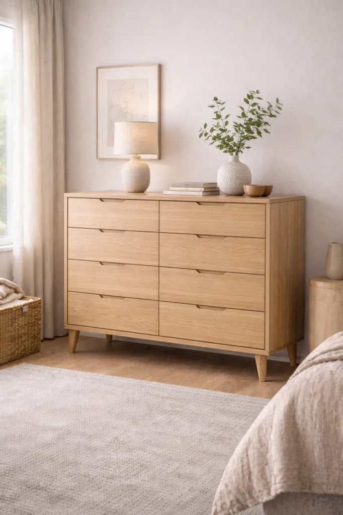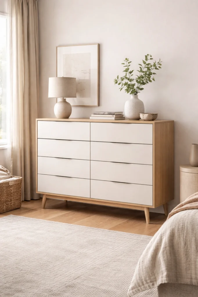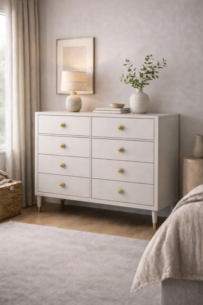 This chest of drawers idea works beautifully as a statement piece, especially when paired with artwork or a large mirror above. Wide chests help visually ground the room and offer easy access to organized storage, combining practicality with strong design presence.