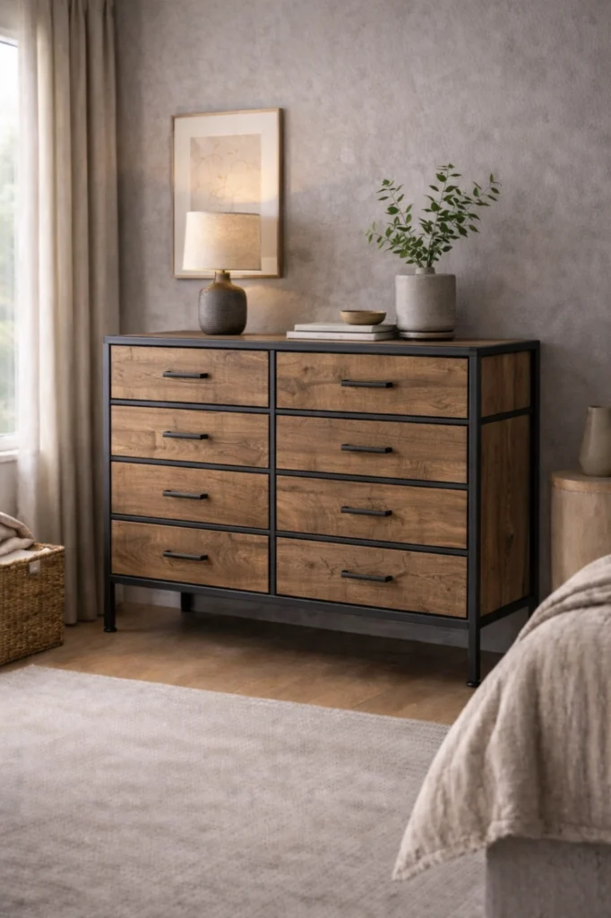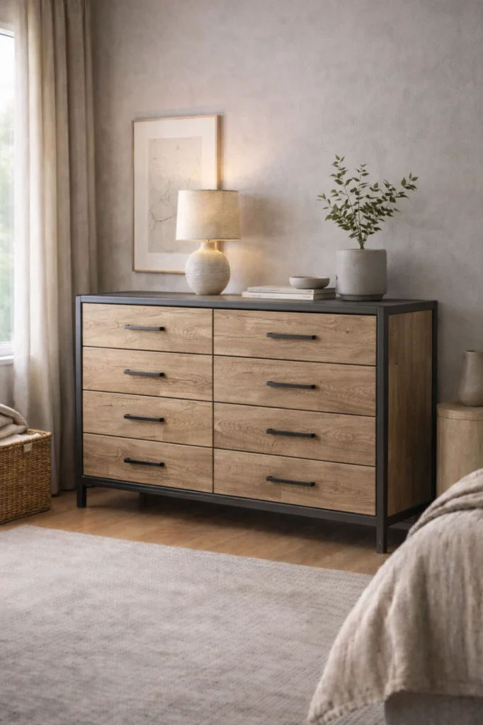 This chest of drawers idea works especially well in industrial or contemporary interiors. Metal frames paired with wooden drawers offer durability and style, while mixed finishes allow flexibility in coordinating with other furniture pieces.