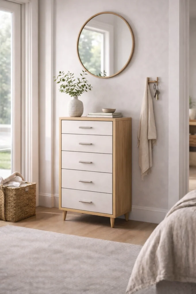 This chest of drawers idea helps keep entryways organized without clutter. Slim designs work best, offering storage without obstructing movement. Styled with mirrors or decorative items, hallway chests create welcoming first impressions.