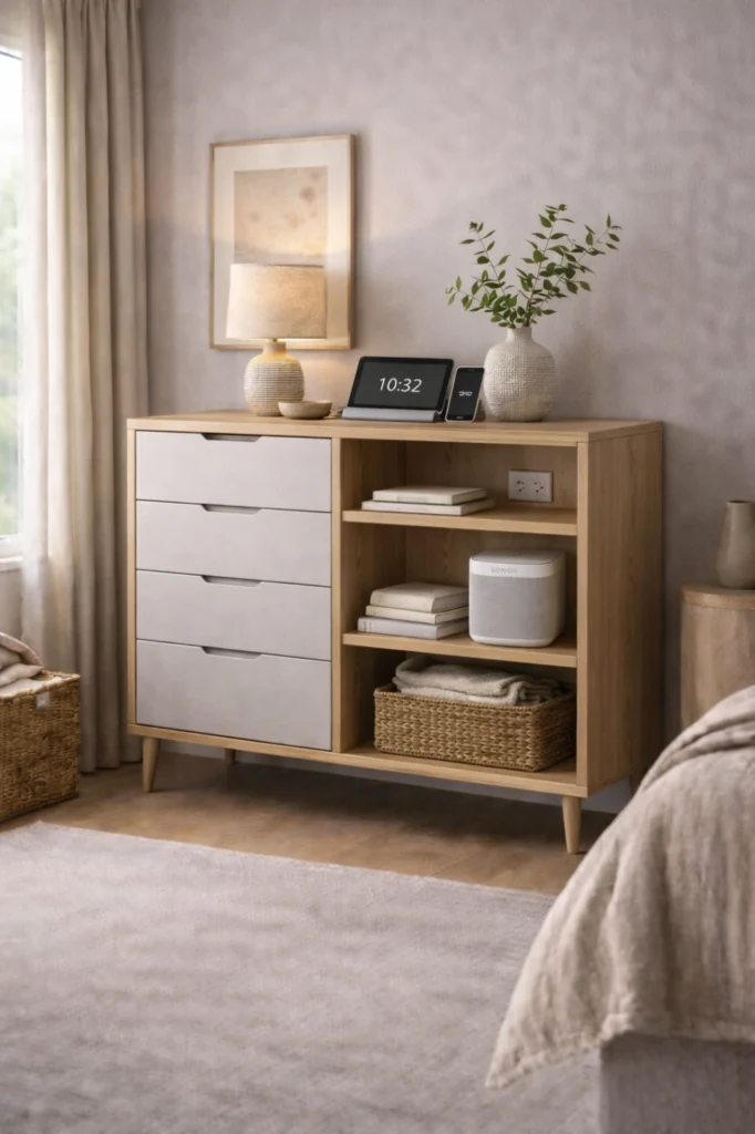 Combining drawers with open shelving adds versatility and visual interest. This chest of drawers idea allows you to display decorative items while keeping essentials hidden.