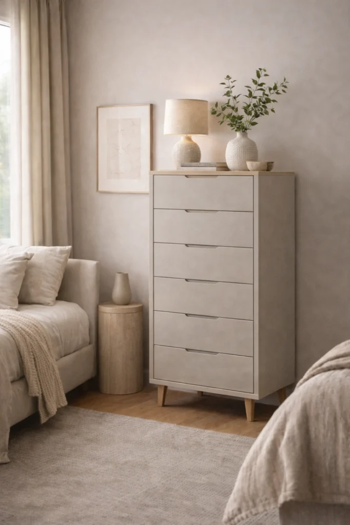 This chest of drawers idea offers ample storage for clothing, accessories, or linens without overcrowding the room. Tall designs can also act as a visual anchor, drawing the eye upward and enhancing the sense of height in the space. Styled with subtle décor on top, they balance functionality with elegance.