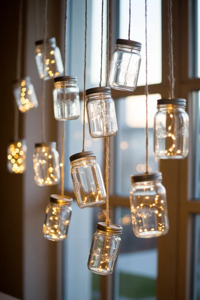 These hanging light jars give off a soft, floating glow — ideal for cozy living spaces. Add faux snow or glitter for extra sparkle.